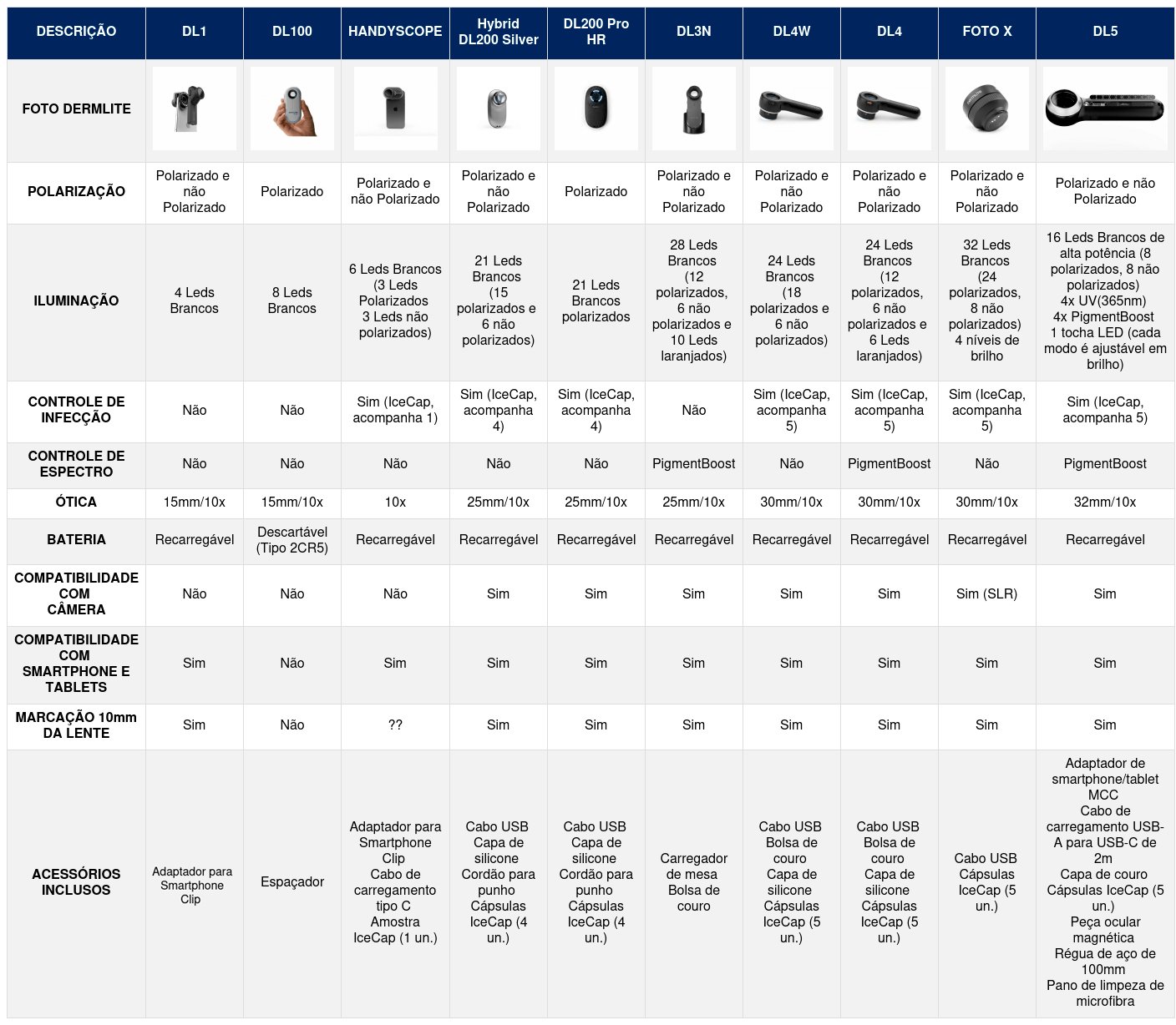 Tabela Comparativa Dermatoscópios: